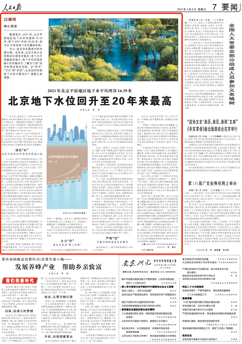 近年來,北京市持之以恒推動河湖生態(tài)復蘇,地下水開采量逐年減少,地下水位實現(xiàn)連續(xù)6年持續(xù)回升。據(jù)來自北京市水務局的數(shù)據(jù)顯示,2021年,北京平原地區(qū)地下水平均埋深16.39米,高于2001年的16.42米,成為近20年來地下水位最高的年份,超采區(qū)面積比2015年最嚴重時減少82%,健康水體達到86%,首都綠水青山底色不斷擦亮。