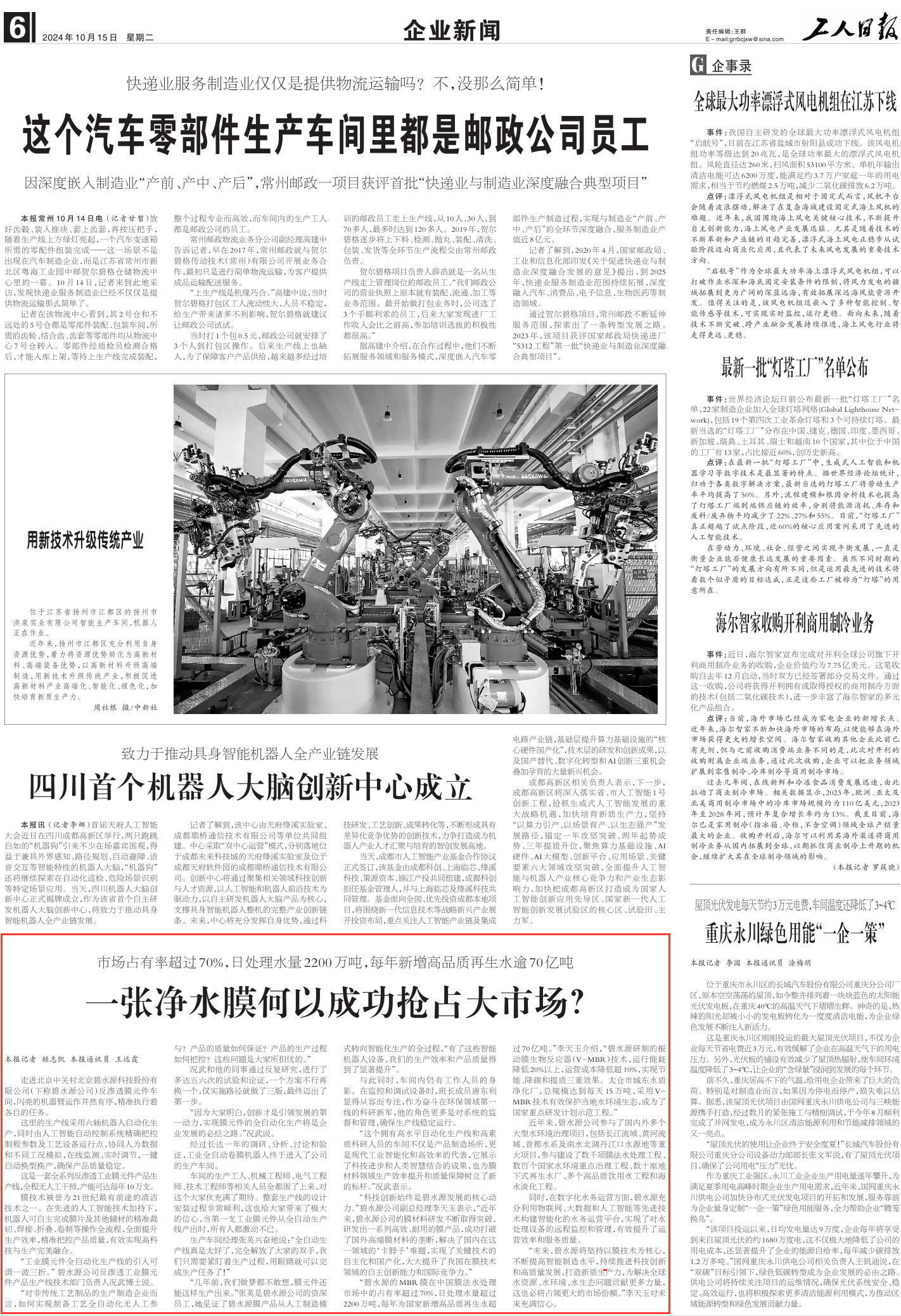 走進北京中關村北京碧水源科技股份有限公司(下稱碧水源公司)反滲透膜元件車間,閃亮的機器臂運作井然有序,精準執(zhí)行著各自的任務。